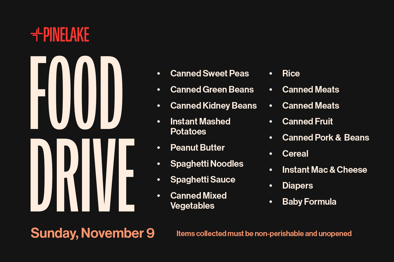 You can drop off non-perishable food items at any Pinelake Campus on Sunday, November 9 at any service. Each donation helps bless those facing food insecurity this season.